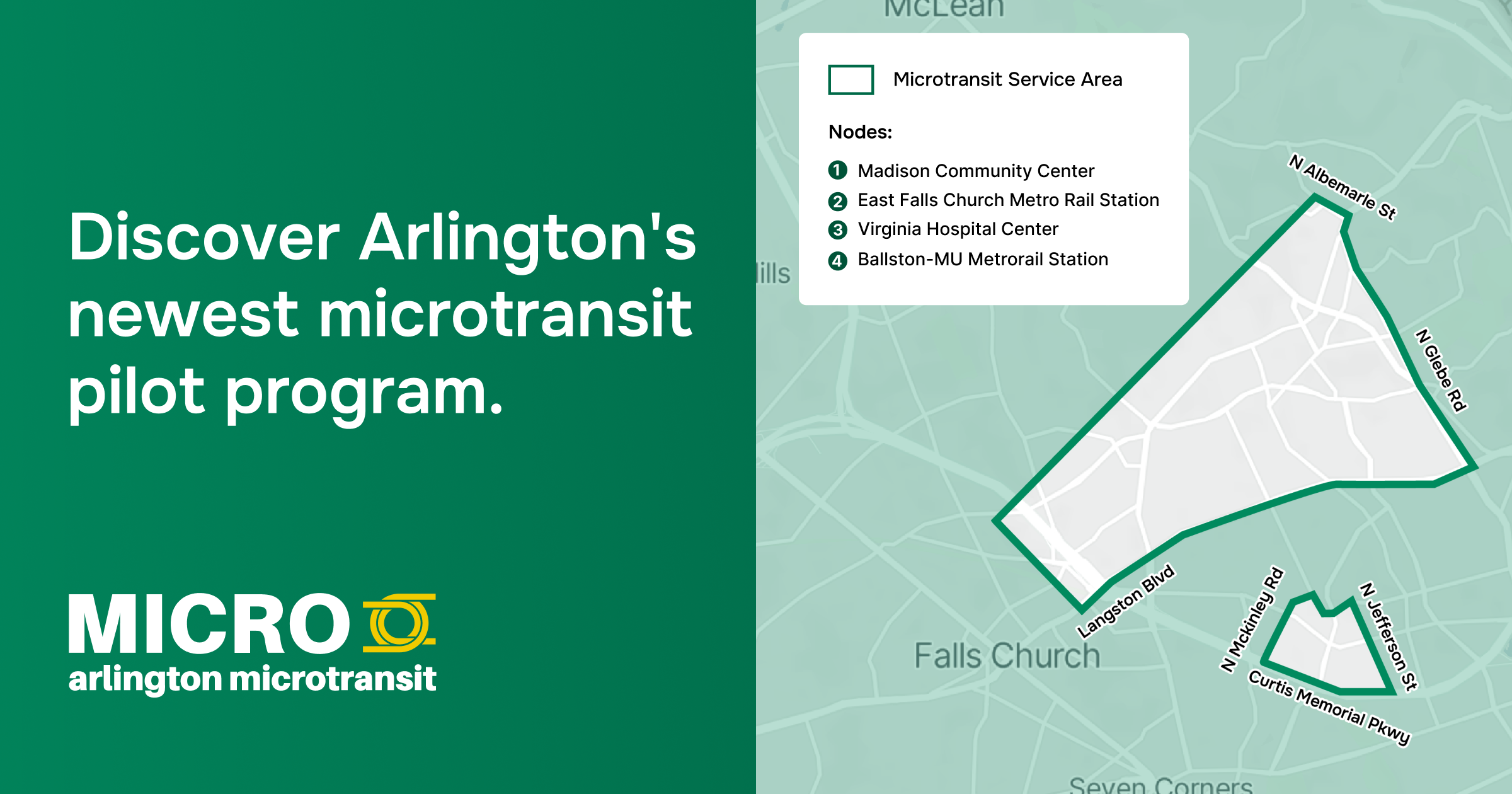 During the initial period, MICRO will operate within a defined zone in northwest Arlington, generally bound by North Glebe Road, Langston Boulevard and the County line. The service connects riders to key destinations and nodes including Ballston-MU and East Falls Church Metrorail stations, Virginia Hospital Center, Madison Community Center, local schools and the Westover neighborhood.