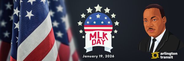 Service AlertsMartin Luther King Jr. Day Holiday Service: In observance of Martin Luther King Jr. Day, Mon., Jan. 19, ART 41, 42, 45, 51, 55, 77, and 87 will operate on Saturday schedules. The STAR Call Center will also be closed, and all standing orders, except for dialysis, will be canceled. Thank you for riding Arlington Transit! View all ART Alerts